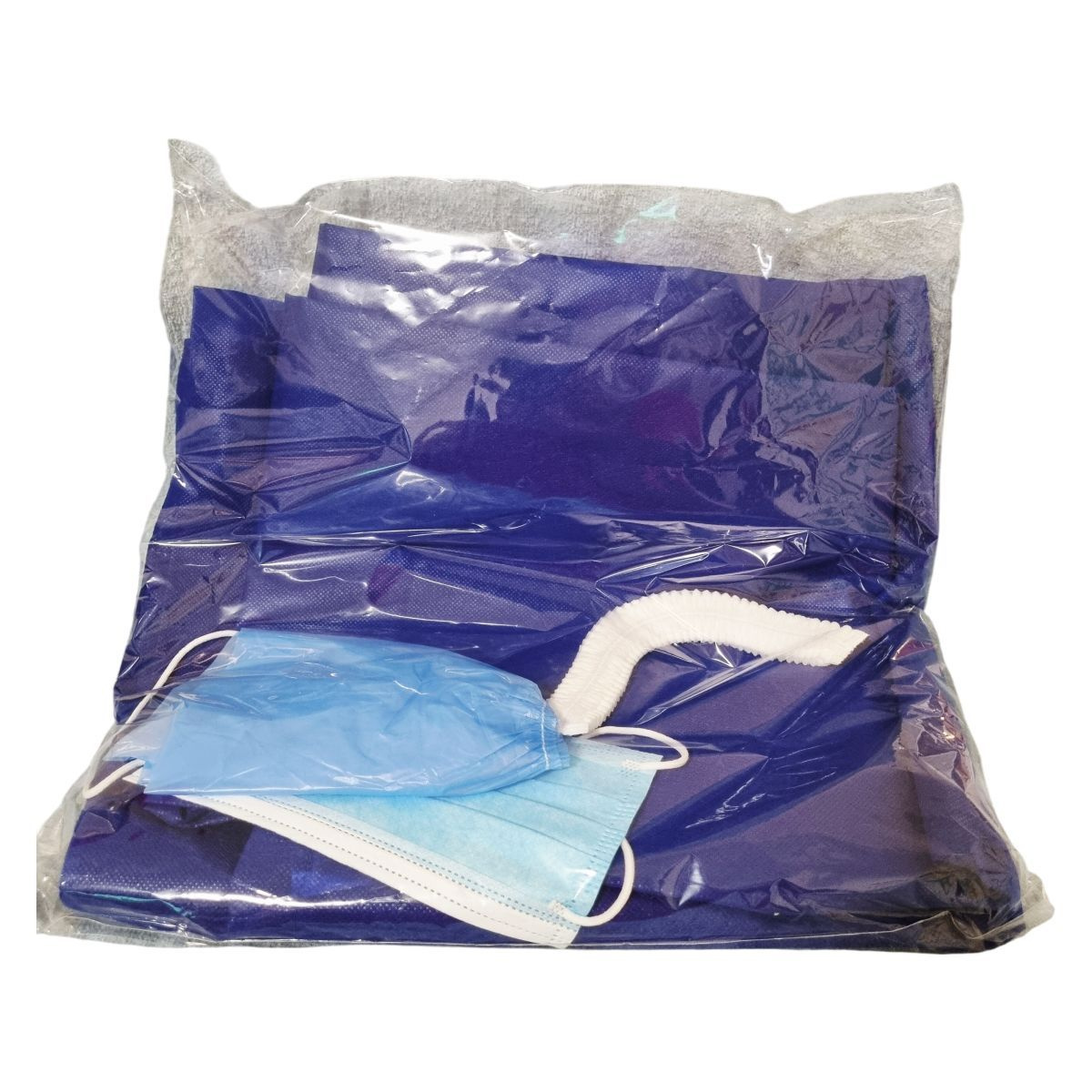 1 db 3 rétegű gumis szájmaszk, 1 db gumis hajvédő, 1 db nem szőtt textil ing, 1 db nem szőtt textil nadrág, 1 pár cipővédő