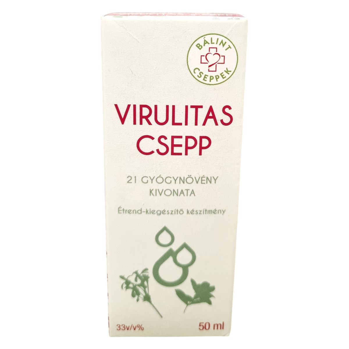 A Virulitas csepp 21 gyógynövény kivonatát tartalmazza, köztük afrikai muskátlit, bodorrózsát és ökörfarkkórót, amelyek antioxidáns tartalmuk révén támogathatják az immunrendszert és enyhíthetik a légzési problémákat. A termék 33 v/v% alkoholt tartalmaz, és üledékesedés előfordulhat, ami nem befolyásolja a minőségét. A nettó térfogat 50 ml.