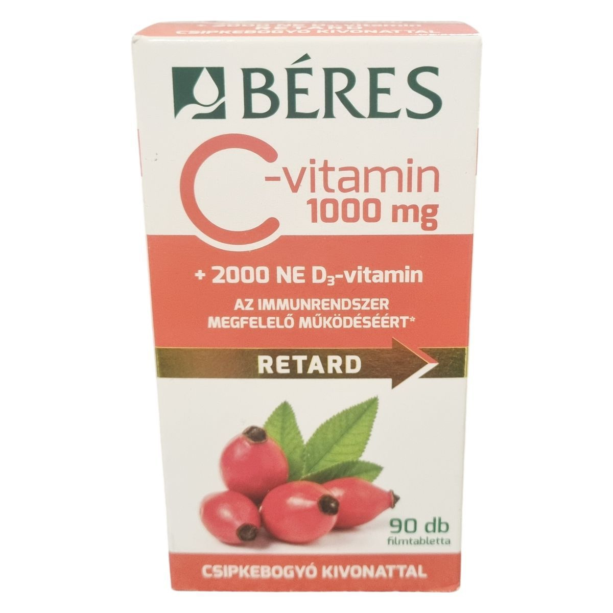 A Béres C-vitamin 1000 mg + 2000 NE D3-vitamin retard filmtabletta csipkebogyó kivonattal étrend-kiegészítő készítmény, melynek egy filmtablettája 1000 mg C-vitamint, 50 µg (2000 NE) D3-vitamint és 25 mg csipkebogyó száraz kivonatot tartalmaz, utóbbi 2:1 drog:extraktum arányban. A C-vitamin hozzájárulhat az immunrendszer és az idegrendszer megfelelő működéséhez, a fáradtság és a kifáradás csökkentéséhez, továbbá a normál energiatermelő anyagcsere-folyamatokhoz. Emellett antioxidáns hatású anyagként a sejtek oxidatív stresszel szembeni védelmét támogathatja. A D-vitamin az immunrendszer normál működésében és az egészséges izomfunkció fenntartásában játszhat szerepet, valamint részt vehet a sejtosztódás folyamatában. A termék ellenőrzött alapanyagokból és rendszeresen ellenőrzött hatóanyag-tartalommal készül, hazai fejlesztésű készítményként. Alkalmazása javasolt többek között egyoldalú, vitaminhiányos táplálkozás esetén, fokozott vitamin-szükséglet idején, betegségeket követő felépülés során, valamint fáradtság és jelentős fizikai igénybevétel időszakában.