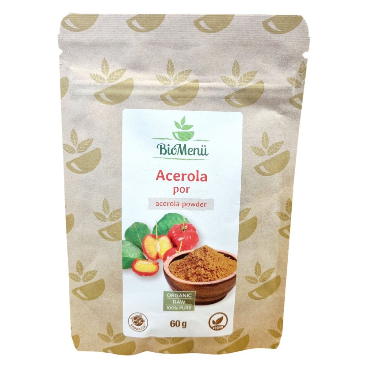 A BioMenü BIO ACEROLA bogyó por egy 100% bio, fagyasztva szárított acerola termék, amely Brazíliából származik. Az acerola, más néven barbadoszi cseresznye, gazdag C-vitamin forrás lehet, és antioxidáns tulajdonságokkal bírhat. A termék vegán, bio és raw étrendi irányzatoknak is megfelelhet. A por könnyen feloldható tejben vagy gyümölcslében, és naponta 3-5 gramm ajánlott belőle. A termék rendkívül nedvszívó, ezért tárolása során ügyelni kell a megfelelő körülményekre. A termék minőségét nem befolyásolja, ha csomóssá válik, mivel összetörve újra por állagúvá válik.