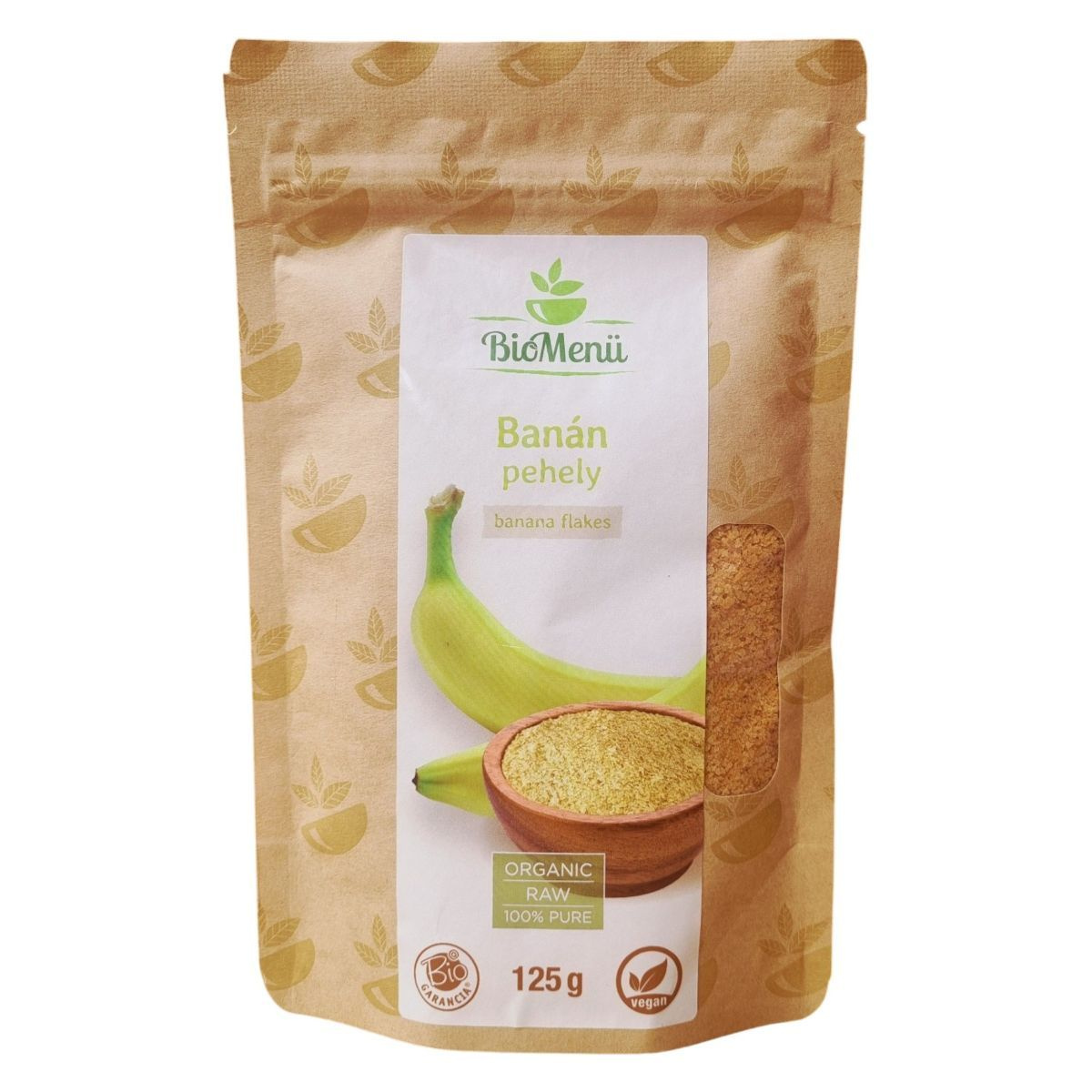 A BioMenü BIO BANÁN pehely egy 100% bio banánból készült termék, amely Ecuadorból származik. A termék vegán, bio és raw minősítésű, és ideális különféle ételek ízesítésére, mint például turmixok, sütemények, gyümölcslevek, fagylaltok és müzlik. A termék táplálkozási tulajdonságai változhatnak a környezeti feltételektől függően, illetve az idő múlásával. A termék forgalmazója a Caleido IT-Outsource Kft., és rendelkezik HU-ÖKO-02 tanúsítvánnyal.