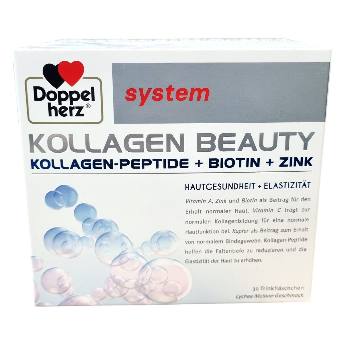 A Doppelherz® system Kollagen Beauty ivóampullái kollagén-peptideket, vitaminokat, ásványi anyagokat és açaibogyó-kivonatot tartalmaznak, melyek lychee-melone ízesítésűek. A C-vitamin hozzájárulhat a normál kollagénképződéshez és így a bőr normál működéséhez, továbbá a C-vitamin, cink és E-vitamin segítheti a sejtek oxidatív stresszel szembeni védelmét. Az A-vitamin, cink és biotin fontos lehet a bőr, haj és köröm egészségének fenntartásában. A kollagén-peptidek hozzájárulhatnak a bőr rugalmasságának növeléséhez és a ráncok mélységének csökkentéséhez. Az ampullák vízből, körte koncentrátumból, citromsavból, xantánból, valamint többféle tartósító- és édesítőszerből készülnek. A termék alkalmazása 14 év alatti gyermekek számára nem ajánlott, és nem helyettesíti a kiegyensúlyozott étrendet és az egészséges életmódot.
