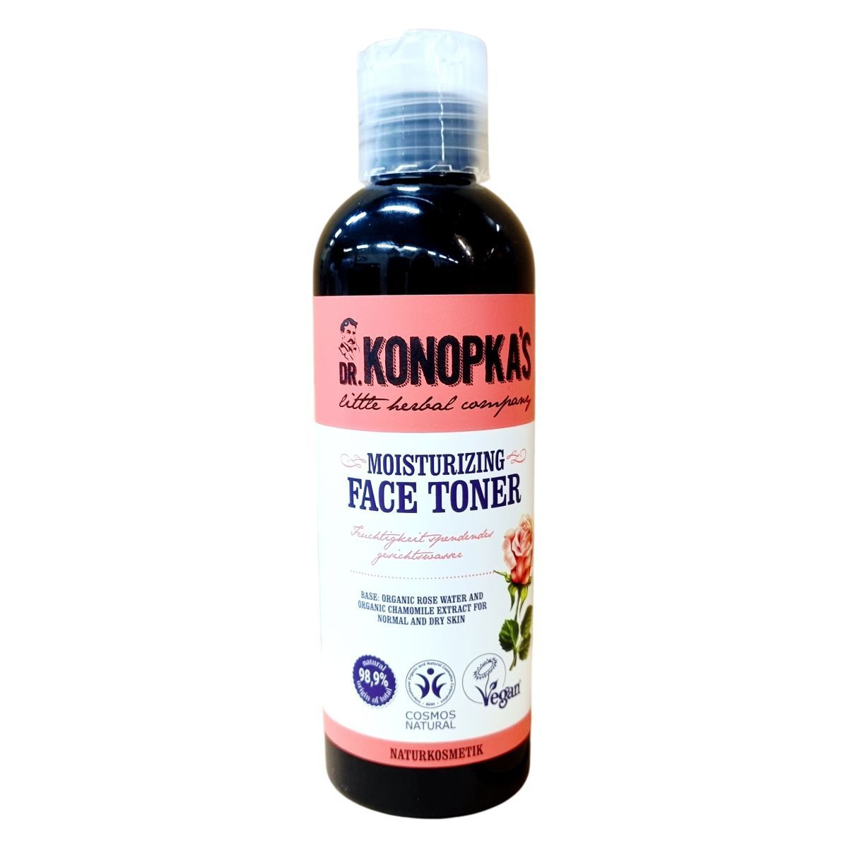 A Dr. Konopka's Hidratáló arctonik bio kamillakivonatot és bisabololt tartalmaz, amelyek nyugtatják és kisimítják a bőrt. A rózsavíz gyengéden tisztít, helyreállítja a bőr természetes nedvességszintjét, így a bőr puhábbá és érzékenyebbé válik. Az összetevők 98,9%-a természetes eredetű, a termék Cosmos Natural minősítéssel és vegán natúrkozmetikumként készült. Különféle gyógynövény alapú készítményekkel kínált kis manufaktúrából származik, mely receptek generációkon át öröklődtek. A tonikot Európában gyártják.