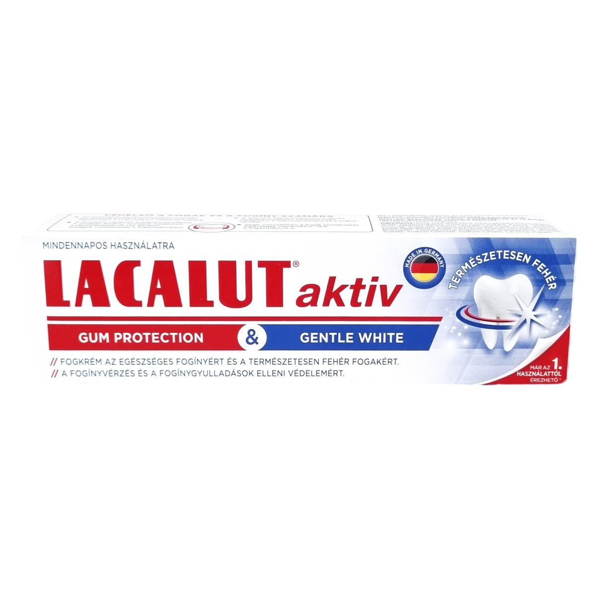 A Lacalut aktiv Gum Protection & Gentle White fogkrém speciális, enzimeket tartalmazó hialuron-komplex formulával készült, mely erősíti a szájüreg természetes ellenálló képességét és hidratál. A fluorid védi a fogakat a szuvasodástól, míg az ásványi anyagok megelőzik a fogzománc ásványianyag-veszteségét. A kíméletes aktív összetevők ápolják és erősítik a fogínyt, segítenek megelőzni a fogínygyulladást és a vérzést, miközben támogatják a fogak természetes fehérségének visszaállítását anélkül, hogy károsítanák a fogzománcot. A fogkrém közepes abrazív hatású, így minden nap használható. A termék szánkóvásdai védelem mellett kíméletes fehérítő hatással is rendelkezik, már az első használattól érezhető a hatás.