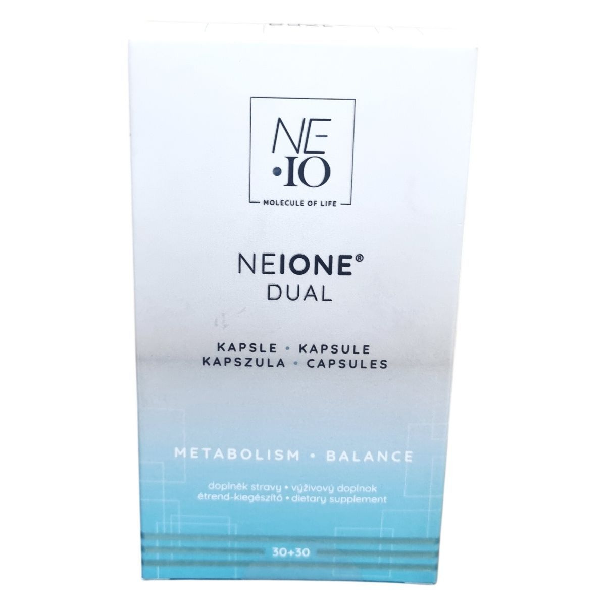 A Neione® DUAL kapszula kettős összetételű étrend-kiegészítő. Az egyik kapszula port tartalmaz, melyben mikrokristályos cellulóz, nátrium-L-aszkorbát, cink-citrát, szőlőhéj kivonat, tengeri só, mangán-szulfát, fekete tea levél kivonat, valamint B-vitaminok találhatók. A másik kapszula olajos pelletet tartalmaz mákolajjal, mezei zsurló kivonattal, szelénnel dúsított élesztővel, E-vitaminnal, rezzel, jódot, D3-vitaminnal és speciális stabilizátorokkal. A napi adag két kapszula bevételét javasolja, amelyek együtt több fontos vitamin és ásványi anyag bevitelét biztosíthatják. A termék nem alkalmazható gyermekek, terhes és szoptató nők számára, és nem helyettesíti a változatos étrendet és az egészséges életmódot. A Neione® DUAL kapszulát a Nature Laboratories, s.r.o. cseh gyártó állítja elő, Magyarországon a MEDIÁR-MAT Kft. forgalmazza.
