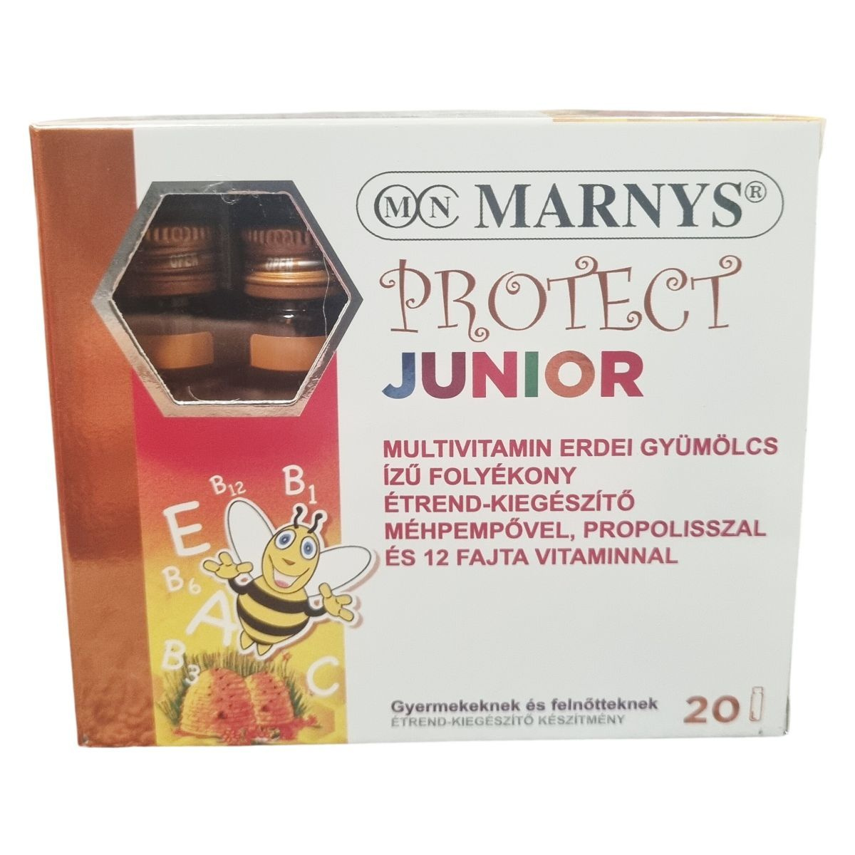 A MARNYS® PROTECT JUNIOR egy többkomponensű folyékony étrend-kiegészítő, amely 12 fajta vitamint, méhpempőt és propoliszt tartalmaz. A benne lévő vitaminok hozzájárulhatnak az immunrendszer megfelelő működéséhez, a fáradtság csökkentéséhez, valamint a nyálkahártyák és a csontok egészséges fejlődéséhez. A készítmény gyermekek és felnőttek számára egyaránt ajánlott, külön hangsúlyt fektetve a 4 éves kortól kezdődő adagolásra. Az erdei gyümölcs ízesítésű folyékony formula megkönnyítheti a bevételt. A termék védőgázas csomagolásban kerül forgalomba, ami biztosítja a minőség megőrzését, és tartalmaz 20 darab, egyenként 10 ml-es ampullát. A termék spanyol gyártmány, amely Magyarországon az Aerosoft Kft. forgalmazásában érhető el.