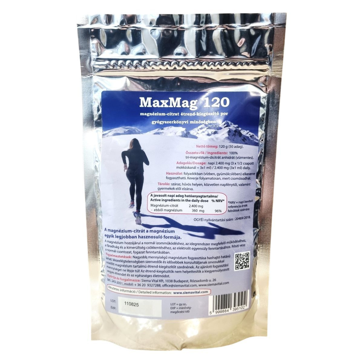 A MaxMag magnézium-citráttartalmú étrend-kiegészítő por gyógyszerkönyvi minőségű, vízmentes tri-magnézium-dicitrát anhidrátot tartalmaz. A termék 120 g nettó tömeggel, 50 adaggal kerül forgalomba. Használata során a javasolt adagot folyadékban (vízben vagy gyümölcslében) kell elkeverni, folyamatos keverés mellett a csomósodás elkerülése érdekében. A magnézium-citrát a magnézium egyik legjobban hasznosuló formája, amely hozzájárulhat a normál izomműködéshez, az idegrendszer megfelelő működéséhez, a fáradtság és kimerültség csökkentéséhez, az elektrolit egyensúly fenntartásához, valamint részt vehet a normál csontozat és fogazat fenntartásában. A terméket száraz, hűvös helyen, közvetlen napfénytől és gyermekektől elzárva kell tárolni. A nagyobb mennyiségű magnézium fogyasztás hashajtó hatású lehet. Veseelégtelenségben szenvedők és idősebb személyek számára fogyasztás előtt orvosi tanács javasolt. Az ajánlott mennyiség túllépése nem ajánlott, valamint az étrend-kiegészítők nem helyettesítik a változatos, kiegyensúlyozott étrendet és az egészséges életmódot.