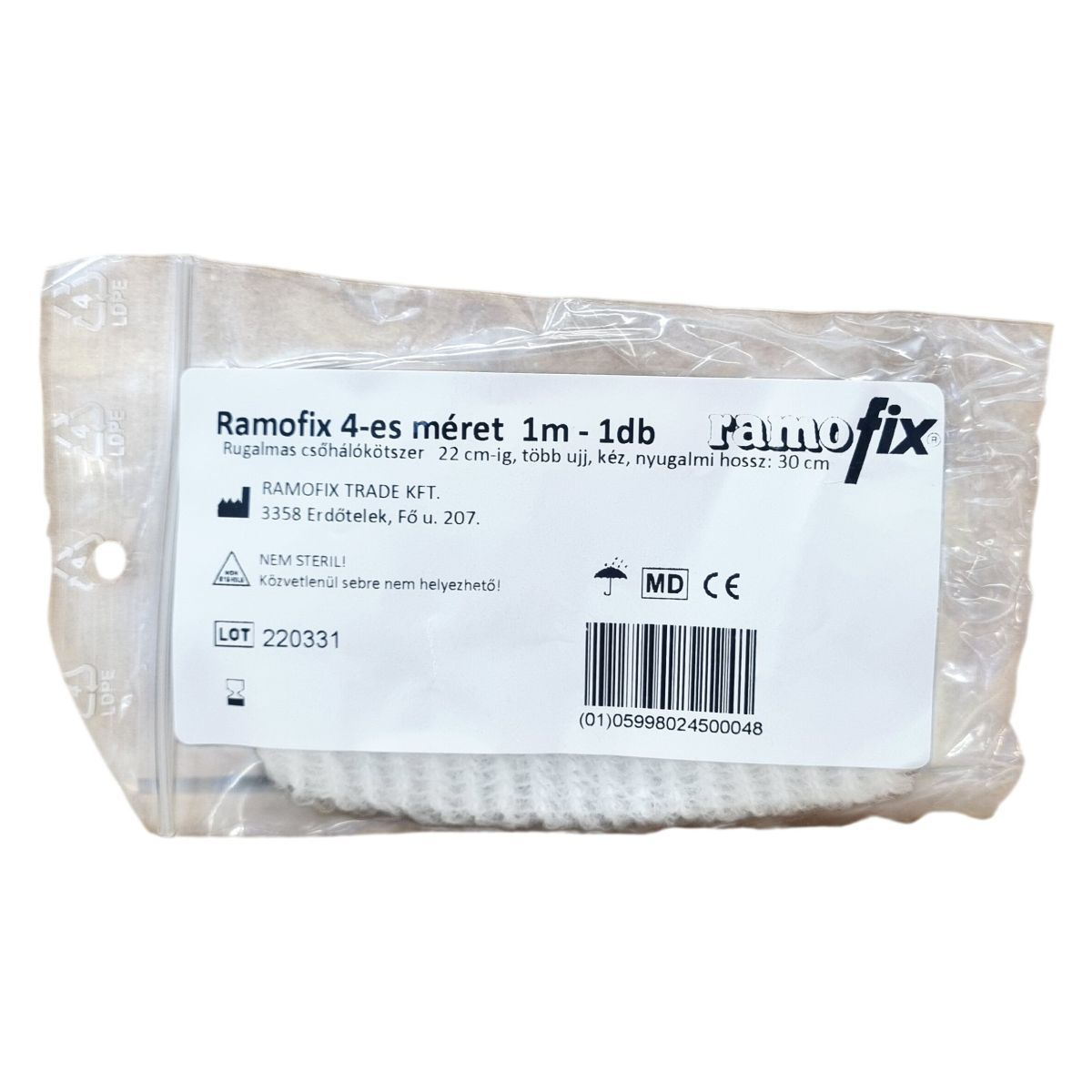 A Ramofix rugalmas csőhálókötözszer 22 cm-ig nyújtható, nyugalmi hossza 30 cm, ideális több ujj és kéz rögzítésére. A termék nem steril és nem helyezhető közvetlenül sebre. A csomagolás 1 méter hosszú, 4-es méretű kivitelben érhető el.