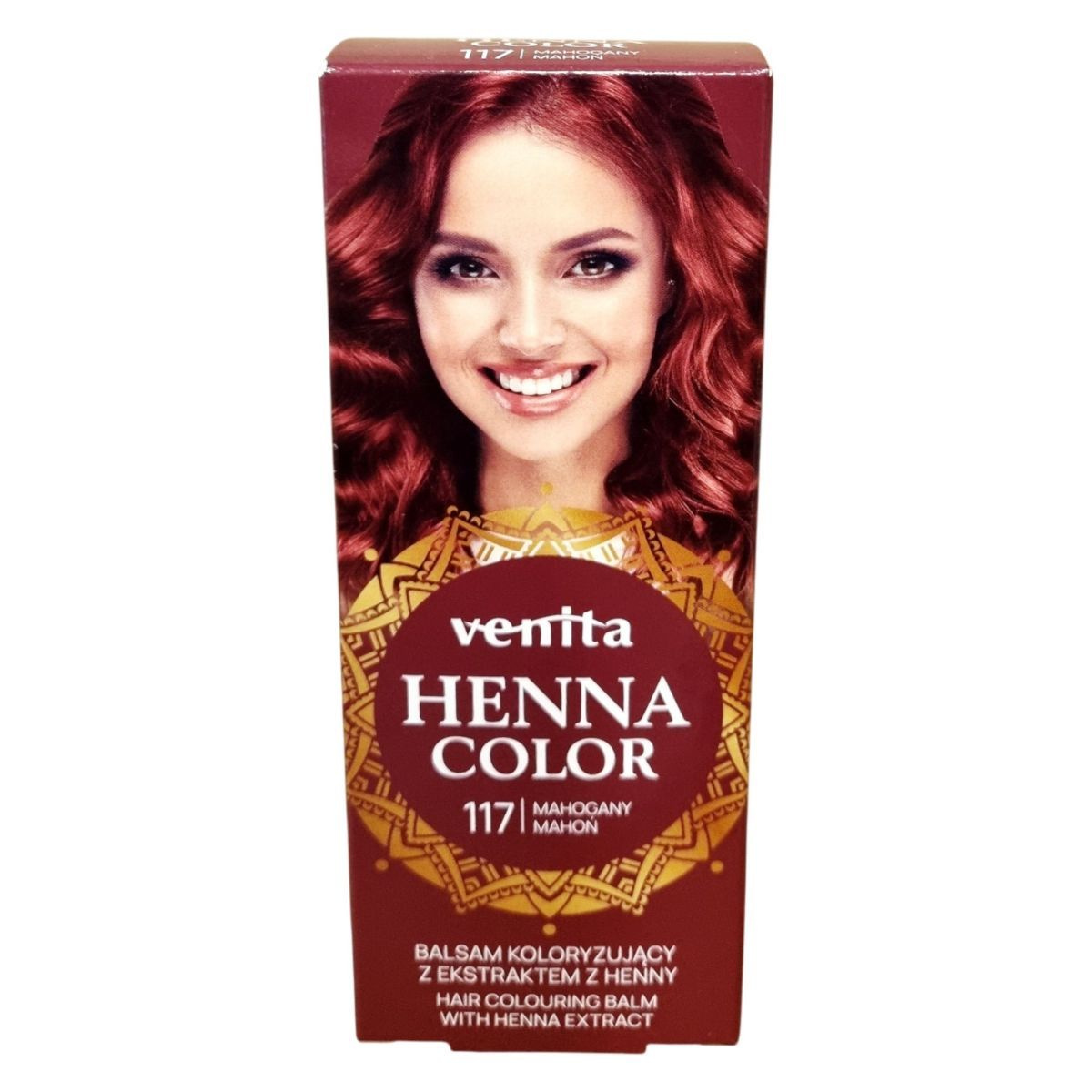 A Venita Henna Color 117 Mahogany hajszínező balzsam kíméletes, természetes összetevőkkel készült formula, amely a hennakivonat erejével adhat gazdag, meleg mahagóni árnyalatot. Használata egyszerű és biztonságos, nem károsítja a hajat. A termék több nemzetközi elismerést nyert, mint például a Quality International és a Perła Rynku Kosmetycznego díjak. Lengyel gyártású, minőségi hajszínező, amely egyesíti a természetes hatóanyagokat és a hajápoló tulajdonságokat. „A hajadnak is van hangja!” szlogen a termék természetes szépségfilozófiáját tükrözi.