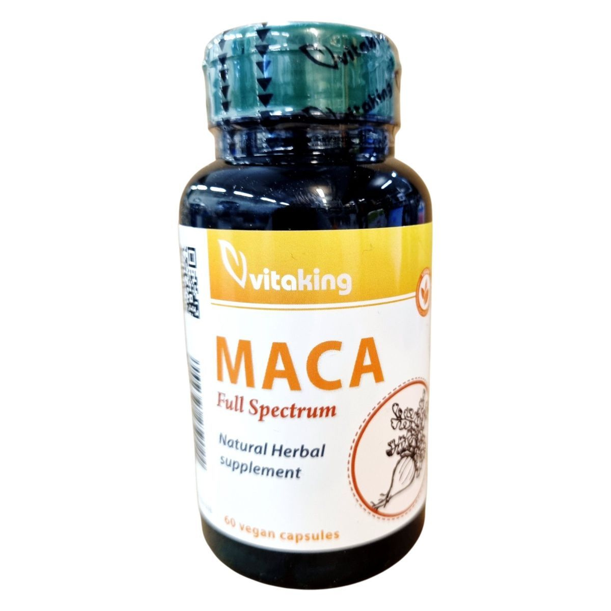 A Vitaking MACA étrend-kiegészítő természetes Maca gyökér port tartalmaz, amelyet a Lepidium meyenii növényből nyernek. A termék 60 vegán kapszulát tartalmaz, és a napi ajánlott mennyiség 3 kapszula. A Maca gyökér hozzájárulhat a vitalitás és az energia támogatásához. A termék összetevői között megtalálható a maltodextrin, a vízmentes dikalcium-foszfát, valamint a hidroxi-propil-metil-cellulóz kapszula. A termék tárolása száraz, hűvös helyen javasolt, gyermekek elől elzárva. A termék OGYÉI engedéllyel rendelkezik, és a Vitaking Kft. forgalmazza.
