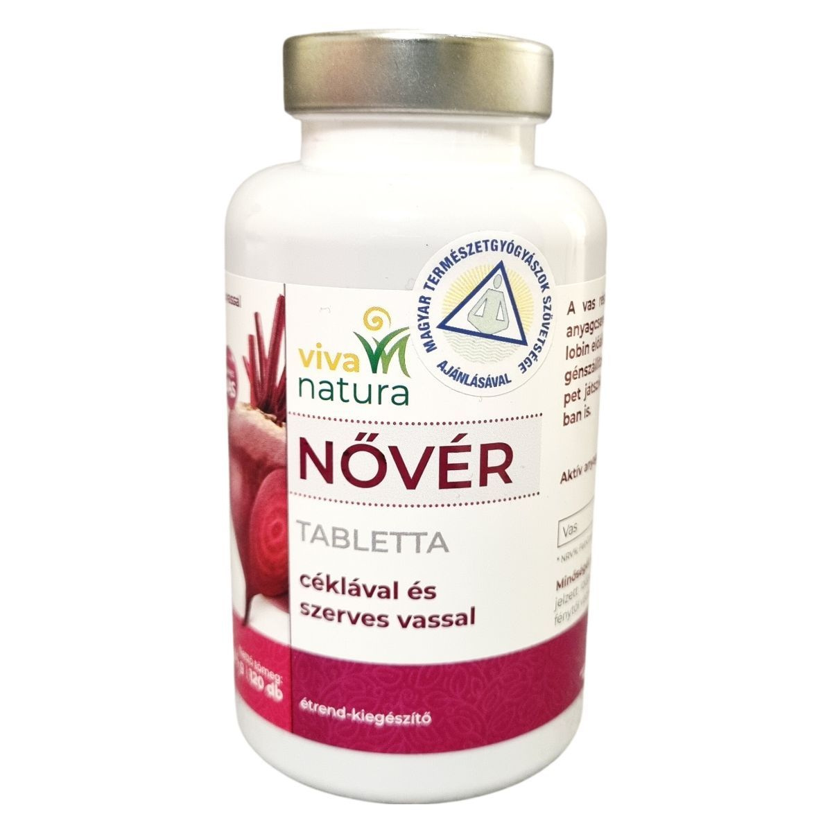 A Viva Natura Nővér tabletta céklával és szerves vassal a vas napi ajánlott mennyiségét biztosítja, amely szerepet játszik a hemoglobin előállításban és az oxigénszállításban is. A termék GMO-mentes, laktóz- és gluténmentes, valamint hozzáadott cukrot nem tartalmaz. Az étrend-kiegészítő összetevői között megtalálható a szárított cékla őrlemény és vas-fumarát, továbbá dextróz és csomósodást gátló anyagok (talkum, magnézium-sztearát). Az esetleges allergének jelenléte nyomokban előfordulhat. A termék megfelel a felnőttek számára ajánlott napi referenciaértékeknek, és alkalmas kiegészítője lehet a változatos étrendnek és az egészséges életmód támogatásának.