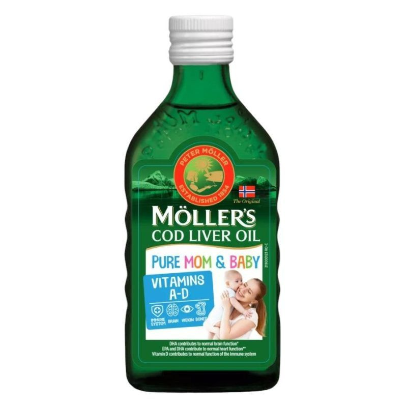 Möller’s Baby Omega-3 halolaj étrend-kiegészítő A- és D-vitaminnal. Esszenciális omega-3-ban gazdag tőkehalmájolajból készült termék. A tőkehalakat a norvég tengeren, Lofoten és Vesterålen környékén fenntartható módon halásszák. A DHA hozzájárul az agy normál működéséhez, az EPA és DHA a szív normál működéséhez, a D-vitamin pedig az immunrendszer normál működéséhez.