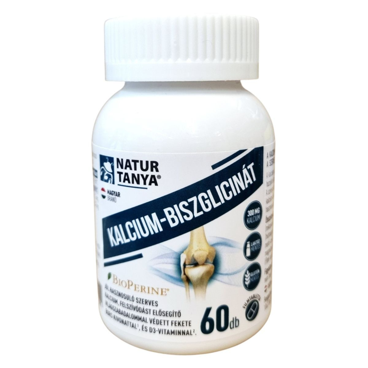 A Natur Tanya Kalcium-Biszglicinát filmtabletta szerves, jól felszívódó kalciumot biztosít, amelynek biohasznosulása magasabb a hagyományos kalcium-sókéval (pl. kalcium-citrát). A D3-vitamin hozzájárulhat a kalcium megfelelő felszívódásához, a fekete bors kivonat (BioPerine®) pedig fokozhatja a tápanyagok hasznosulását. A termék támogatja a csontozat, fogazat és izomrendszer egészségét, valamint az emésztőenzimek működését. Glutén- és laktózmentes, 100%-ban magyar tulajdonú vállalat által forgalmazott étrend-kiegészítő, amely 60 db filmtablettát tartalmaz, nettó tömege 90 g.
